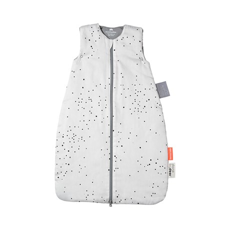 Sovpåsen har en säker dragkedja som öppnas från botten och uppåt, vilket gör det enkelt att byta blöja även under natten. Du behöver inte ta av sovpåsen helt när du byter blöja, och din baby kan fortsätta att sova ostört. Det finns gott om plats för barnets ben att röra sig. Under armarna finns knappar för att justera öppningen vid ärmsluten. Du kan hålla knapparna stängda först och senare öppna dem för mer utrymme för armarna.