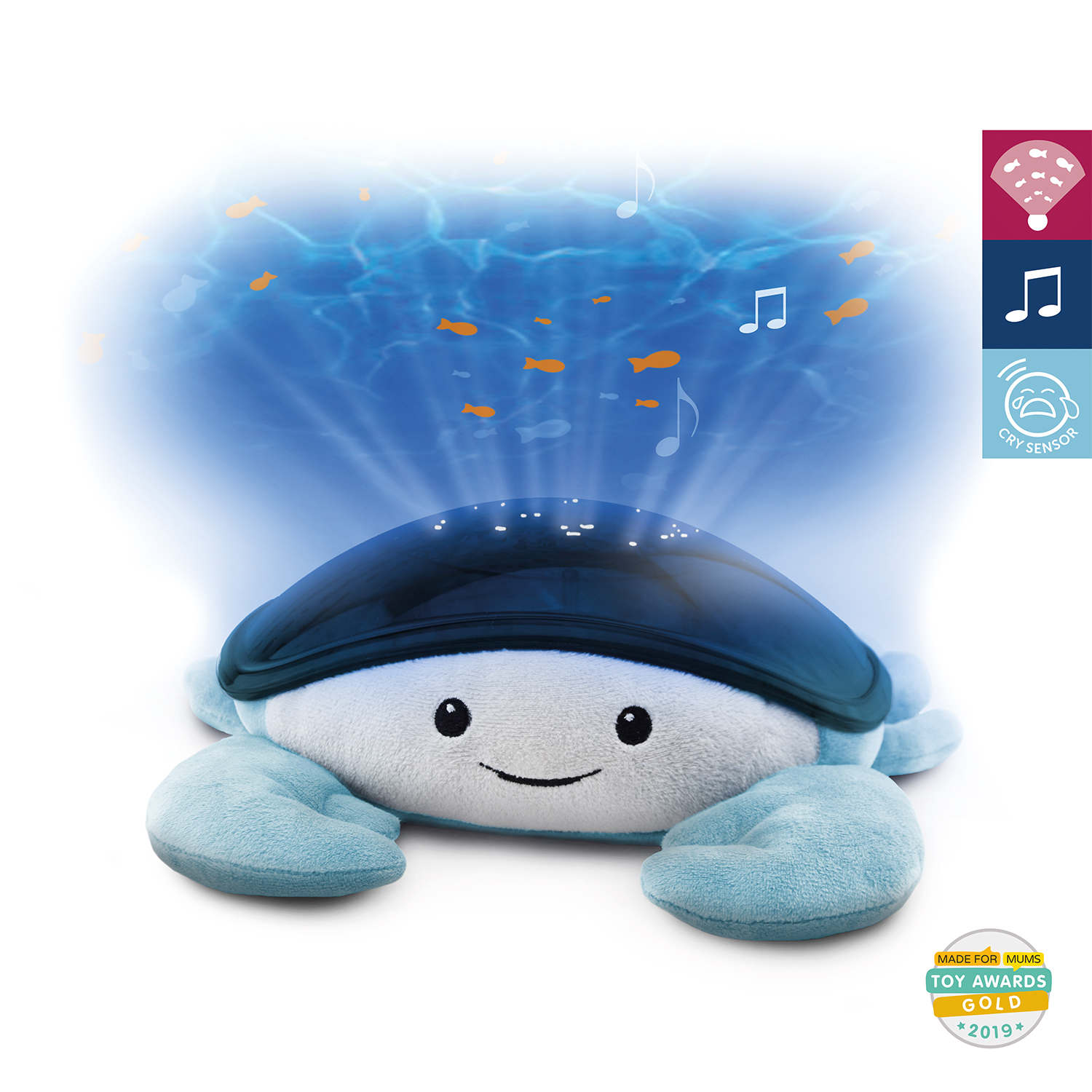 - Sömnleksaken skapar en undervattensatmosfär i barnrummet: rummet reflekterar en havsvärld med rörliga vågor och simmande fiskar. Leksaken spelar även avkopplande havsljud.
