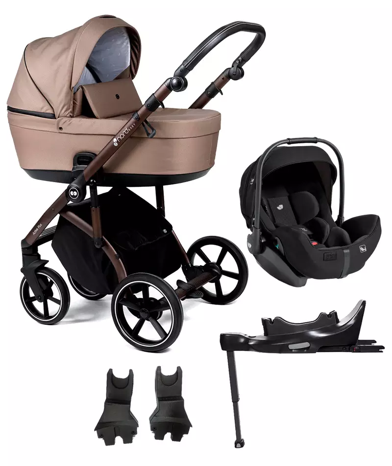 Nord Active PLUS startpaket BRONZE med ram, Joie i-Level Pro bilbarnstol och Encore bas innehåller allt du behöver för att transportera din baby bekvämt och säkert under de första månaderna. Vagnen har en stilren design kombinerad med fantastiska funktioner såsom stora hjul, rymlig liggdel och justerbar fjädring, vilket gör den till ett utmärkt val för mångsidig transport med barnet.
